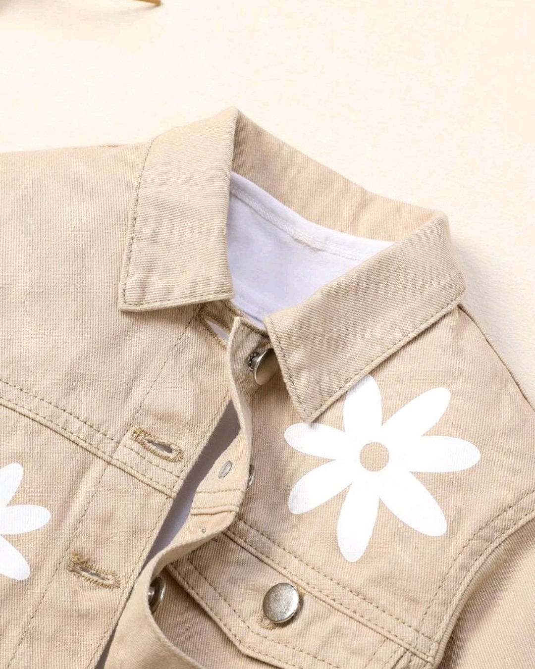 Esta campera tipo denim en tono beige claro es ideal para entretiempo, combinando estilo y comodidad.